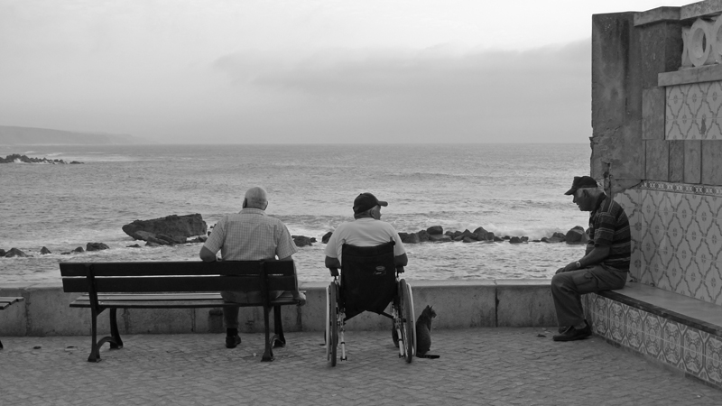 Sunset over the Atlantic. Moments like these are worth cherishing: These fellows turned up every evening at the same time and the same place to chat by the sea. Always with the black cat next to the old man in the wheelchair. Leica. Snap. Later this snapshot received a prize in a photography competition in Finland.