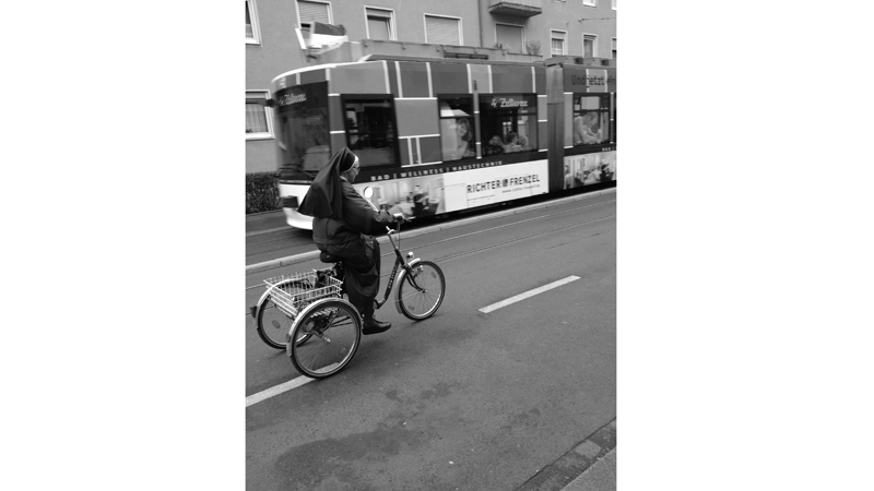 Prize winning entry to an open public photography competition "Meine Stadt" arranged in Würzburg. This snapshot was taken with an iPhone 4S in a classic street photography style. The nun just appeared from nowhere and raced down the street with full-throttle only to disappear into thin air. Amongst other issues, the theme of urban mobility was in focus in this lucky shot.