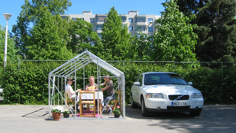 Pop-up one day event to show what you can do in a parking area. The idea was to attract attention and promote public debate about the use of urban space invaded by cars. AREA 51 was sited in a middle of an urban housing estate from the 1950s in downtown Tampere. The name 51 derives from the real number given to the parking space. The whole Guerrilla Urban Environmental Art Happening project was planned, designed and executed in one single day by four people. The aim of AREA 51 was to attract positive attention and promote public debate about the use of urban space invaded by cars. A single car needs 12,5 m2 of parking space, which could be used in a more intelligent, artistic and civilized manner. With AREA 51 the team showed that it is possible to turn an asphalt jungle into a flowering oasis and have fun while enjoying Surreal lunch.