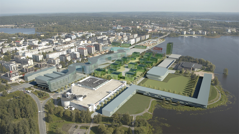 Viinikanlahti International Urban Ideas Competition. Urban design concept for 3500 inhabitants living and working in hybrid-use WoodScrapers in car-free environmentonon the shores of Lake Pyhäjärvi.