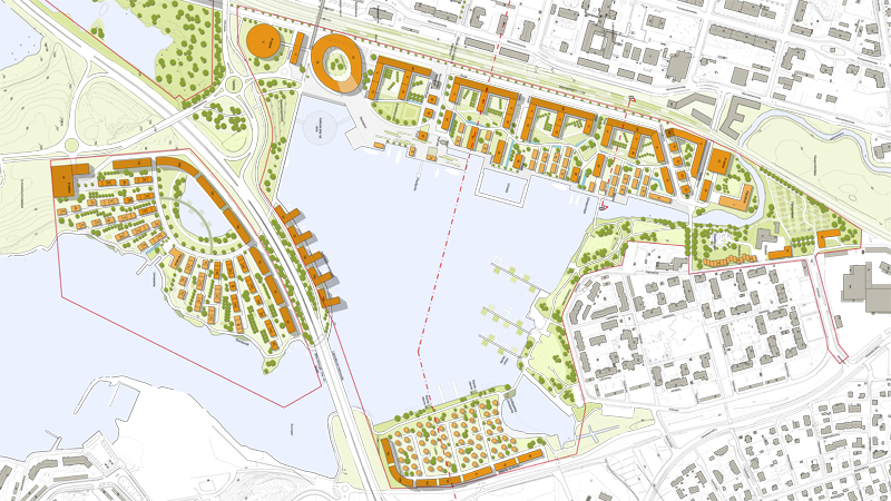 Ideas Competition for the Urban Structure of the South Shore of Hämeenlinna Town Centre. The competition program requested for a variety of housing typologies, extensive ammount of office spaces, sports and recreation facilities and outdoor areas, shopping malls, parking structures, and a new central bus station.