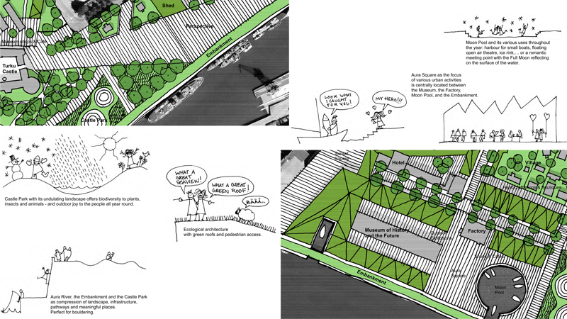 The competition area was divided into three major parts that give both identity and diversity to the overall plan. In the Westside the new Museum of History and the Future is located as a landmark public building at the entry point to the Harbour and the Aura River. The building itself is integrated as part of the new cityscape and landscape by replacing the two existing ferry terminals, and by becoming the highlight of flâneuring along the Embankment with the possibility of walking on the roof of the Museum and admiring the views out to the Archipelago from the rooftop café and sauna.