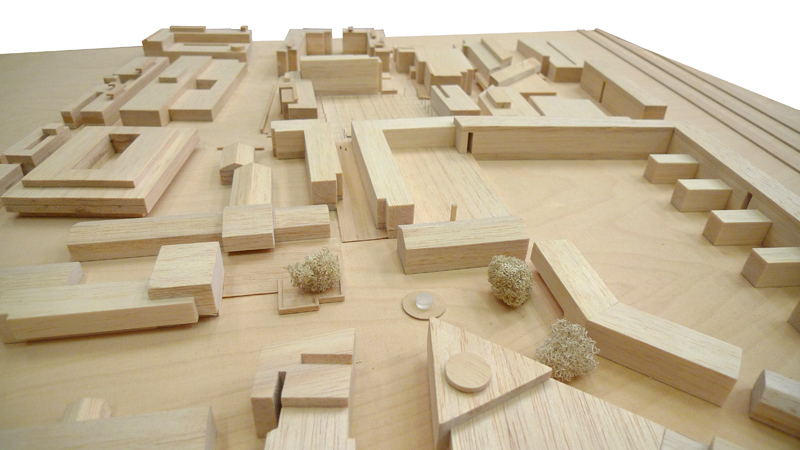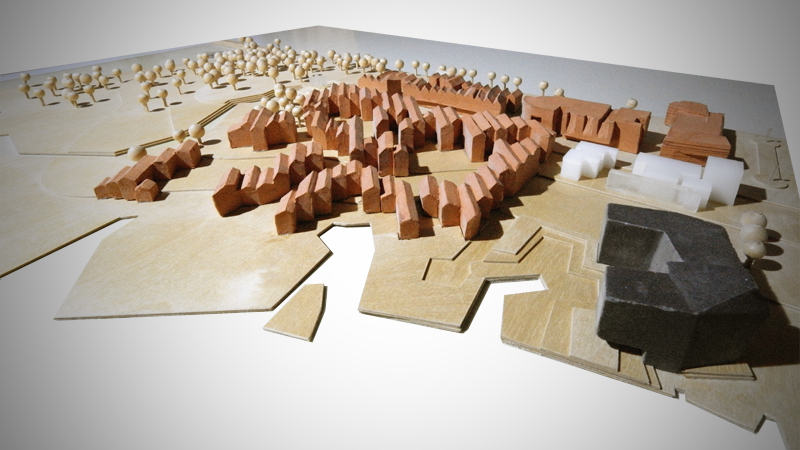 Urban Planning Ideas Competition to the former horse racing track in Vaasa. Human scale urban housing with car-free pedestrian pathways became one of the core ideas for this competition proposal. The white highrise building acts as the landmark and wayfinding symbol for the dense and low wooden housing area.